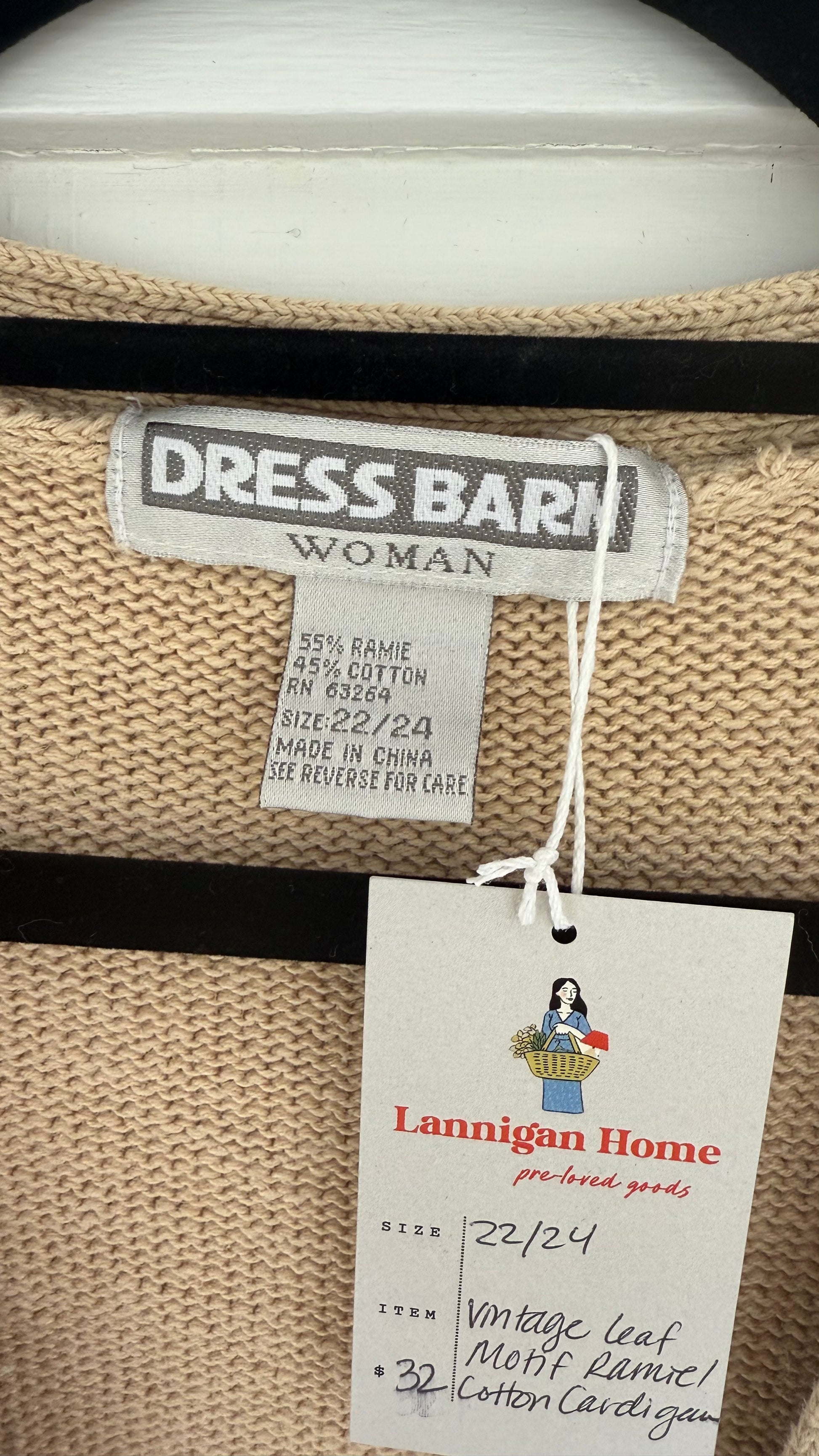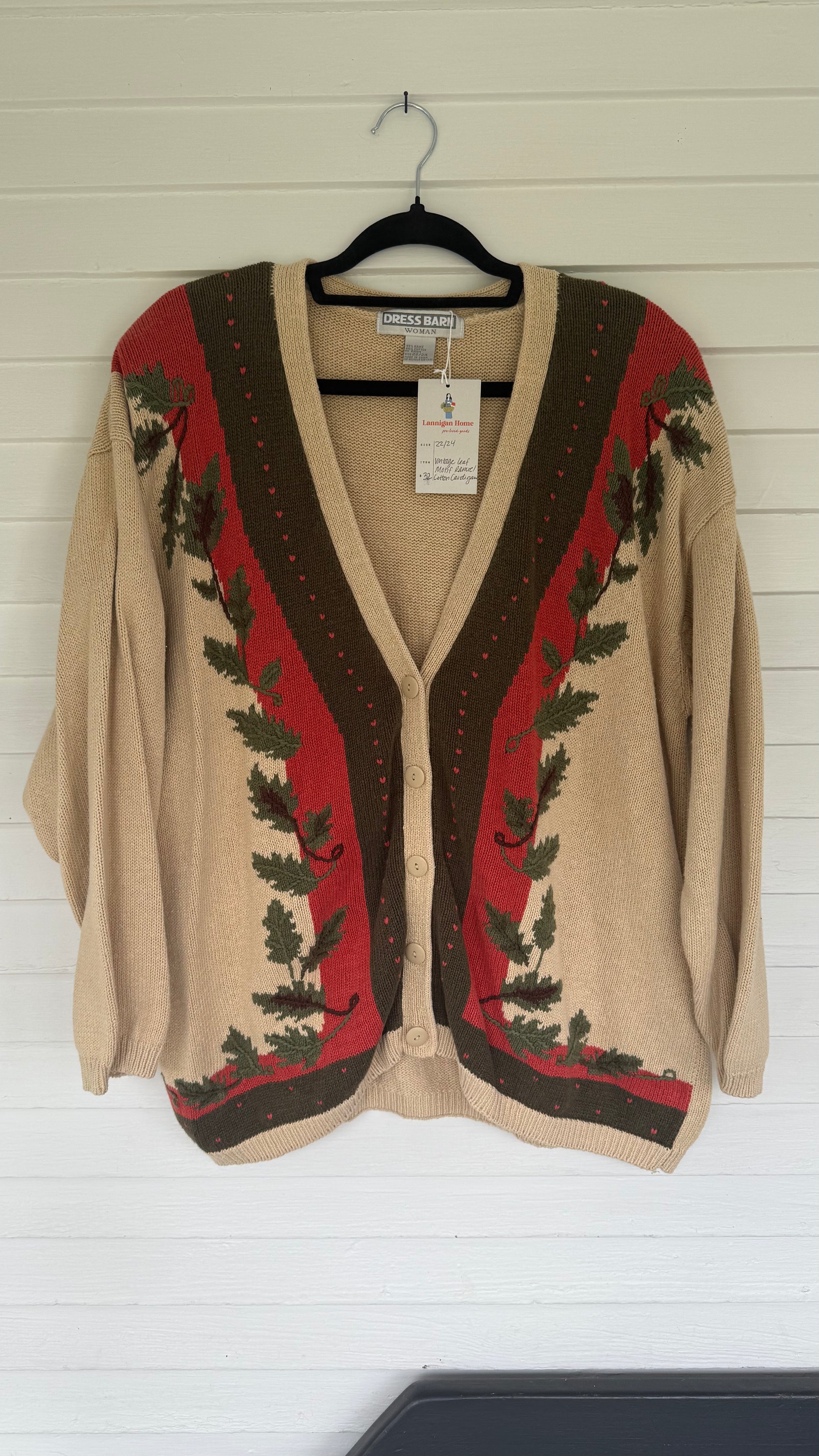 Details: A step-up from a neutral layering piece with leaves and hearts adorning the center. Colors are olive and coral.